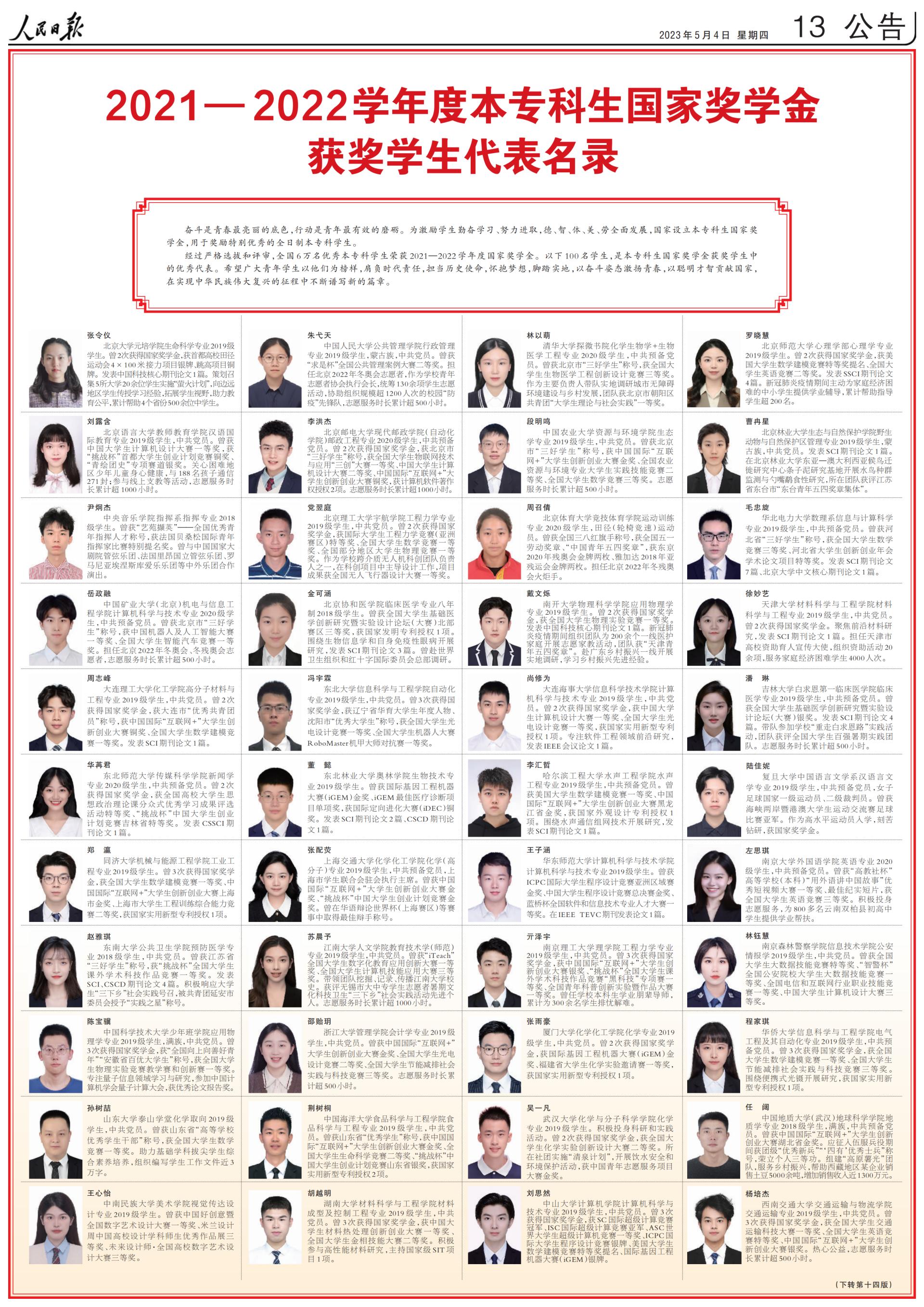 5月4日,《人民日报》专版刊登《2021—2022学年度本专科生国家奖学金获奖学生代表名录》,该名录是从6万名本专科生国家奖学金获奖学生中遴选的100名优秀代表,任阔荣登名录。他表示,自己将以全新的姿态投入到未来的学习与科研生活中。