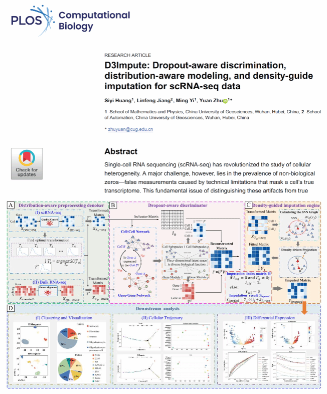 单细胞RNA测序(scRNA-seq)为揭示细胞异质性提供了前所未有的机会,但从采样到测序过程中因技术因素导致的大量非生物学零值仍是数据分析中的核心难题。这些非生物零值掩盖了真实的基因表达模式,若与真正的生物零值混淆,可能严重扭曲下游分析结果。为解决这一挑战,研究团队提出了全新的计算框架D3Impute(Dropout-aware Discrimination, Distribution-aware Modeling, and Density-guided Imputation)。该框架的三大创新点包括:(1)分布感知的预处理去噪器通过建模基因表达分布的统计特性,自适应去除技术噪声并保留真实的生物学差异;(2)Dropout感知的判别器在双网络架构中整合了细胞-基因关系建模,将来自单细胞RNA测序(scRNA-seq)的细胞-细胞交互网络与来自群体RNA测序(bulk RNA-seq)的基因-基因交互网络进行协同结合,能够精准区分生物零与非生物零值;(3)密度感知的插补引擎在共享最近邻图中动态调节权重,选择性重建dropout值,保持局部异质性与全局结构。在实验验证中,研究团队首先进行了不同缺失率(60%、70%和80%)下的模拟实验,结果显示D3Impute 在高缺失条件下依然保持稳健的恢复能力。随后通过模块有效性验证实验,系统评估了三大核心模块的贡献,发现判别器与插补引擎的协同机制在提升零值识别与恢复准确性方面发挥了关键作用。最后在六组多样化数据集上与12种主流方法的系统性对比中,D3Impute在细胞聚类、轨迹推断和差异表达分析等关键下游任务中均表现出持续且显著的提升。综合分析显示,该方法不仅在不同数据质量条件下具备稳健性,还为研究者提供了明确的应用指南。这一成果为单细胞数据分析提供了更精准的工具,并为处理零膨胀数据建立了可推广的计算框架。该研究成果近日发表于《PLOS Computational Biology》,题为:“D3Impute: Dropout-aware discrimination, distribution-aware modeling, and density-guided imputation for scRNA-seq data”。 数学与物理学院2023级博士生黄斯怡为该文的第一作者,朱媛副教授为通讯作者。